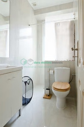 wc(3m2): Chão mosaico, móvel creme, espelho, sanita, poliban, janela.