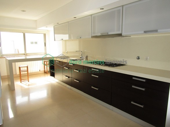 Cozinha(20m2): Chão mosaico, móveis castanhos, tampo pedra, totalmente equipada, mesa em pedra, acesso sala.
