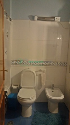 wc1(3m2): Chão mosaico, móvel branco, espelho, completa com banheira, aquecedor e armário.